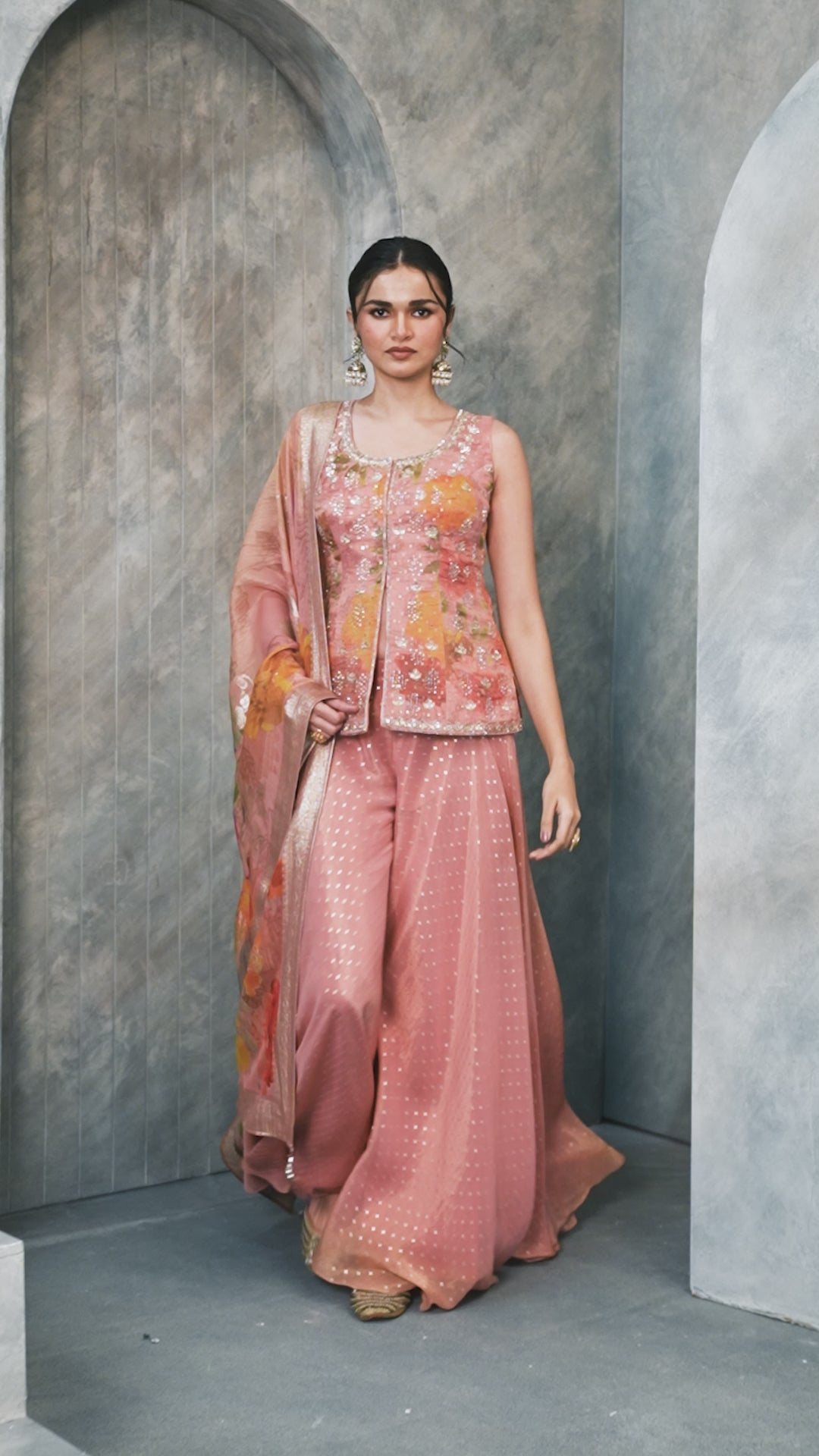 Grace meets modernity in this onion pink peplum set by Taruni, designed for effortless festive charm. The flared silhouette is enhanced with intricate handwork across the top, while the digitally printed dupatta adds a contemporary flair. A perfect blend of tradition and trend, curated for the woman who values subtle sophistication.